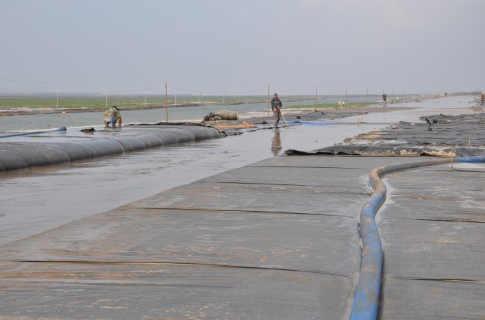 隨后,梁董事長深入到條子泥一期工程全部三個標段的施工現(xiàn)場進行實地察看,詳細了解項目的進展情況,從一標段出發(fā)沿著新筑中隔堤徒步行走到二標段,行程累計近十公里。在看到一、二標段海堤連為一體,條南片墾區(qū)已經(jīng)完成閉合后,梁董事長高興地說,條南片墾區(qū)的閉合標志著條子泥一期工程按照施工總體進度計劃順利完成,項目建設(shè)進入了一個新的階段。下一步要采取積極有效措施,抓緊推進二期工程的前期報批工作,使一二期工程有機銜接,全力推動工程協(xié)調(diào)進展。