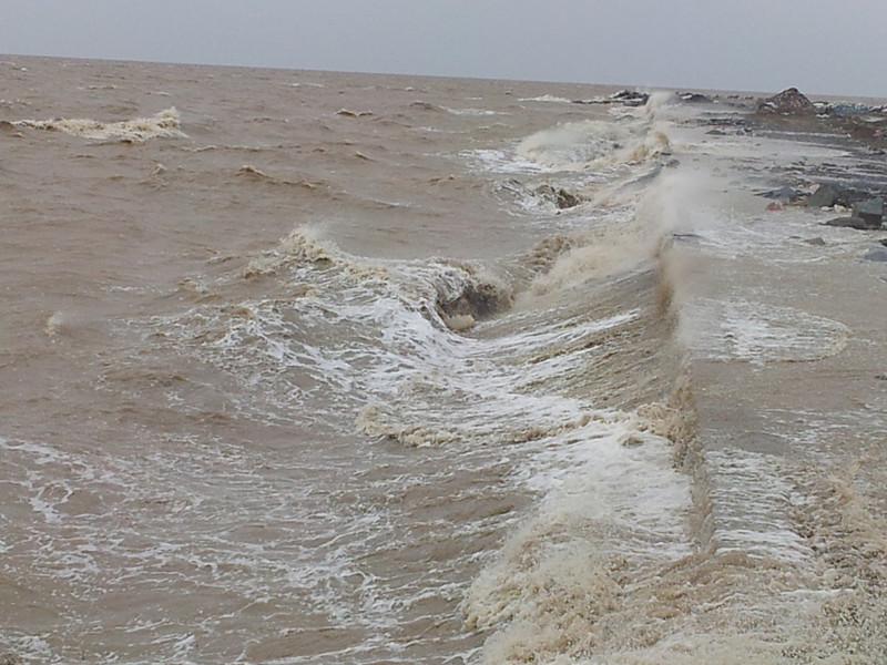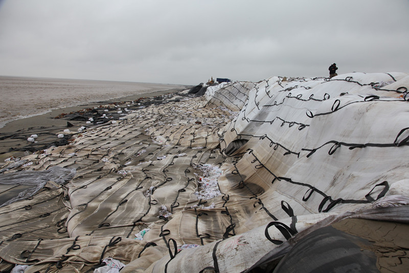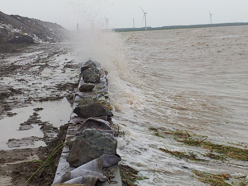 6月7日至9日,黃海南部海域受到入海氣旋及其后部冷空氣共同影響,持續三天8~10級大風。其中6月8日,東臺沿海風力達到10級,大片樹木被連根拔起,適逢農歷初一農歷天文大潮期,海面增水近一米高,最高潮位達▽+5.18米。洶涌的海浪翻滾咆哮,沖擊著正在進行防護結構施工的條北片東堤,致使東堤許多段面防護結構破損,十余處圍堤土方垮塌,最危險的地方堤頂道路寬度僅余2米左右,嚴重影響已成形海堤的安全。