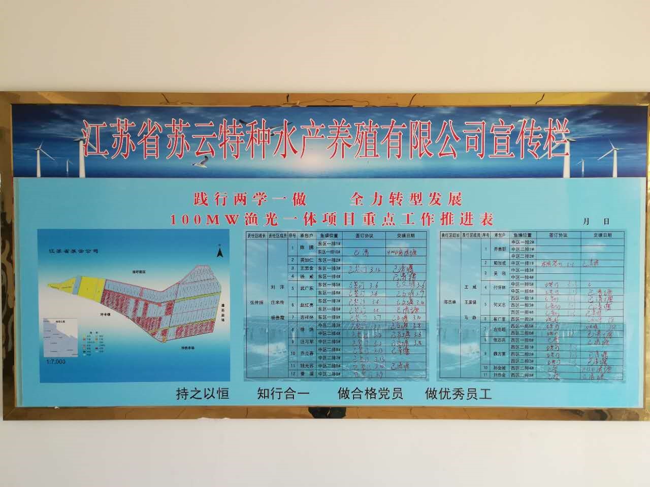 2016年12月,集團公司與通威集團、灌云筑富公司就“漁光一體”項目達成投資意向,江蘇沿海通威富云新能源有限公司應運而生。以新能源公司為投資主體,依托蘇云公司土地,實施“漁光一體”項目,形成光伏發電和高效養殖的有機結合,項目的啟動標志著蘇云公司開啟轉型升級新篇章。