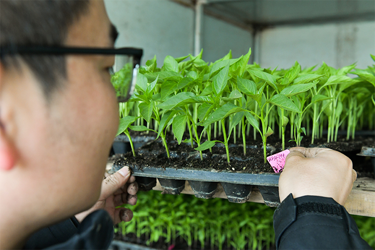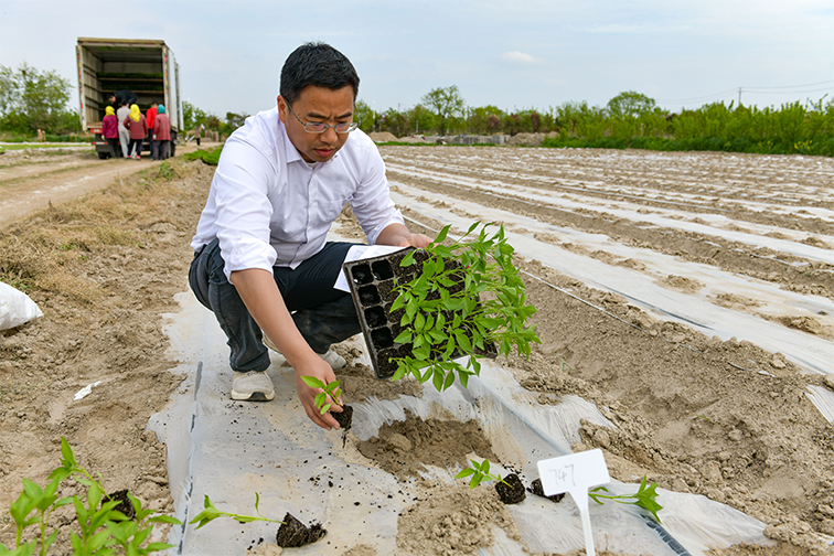 在距離劍豐試驗田70余公里的南通如東縣,省沿海集團所屬凌洋公司“揭榜掛帥”示范基地,數百個品種的辣椒苗整齊堆放在田埂上,爭先往外冒著綠芽兒,一派勃勃生機。江蘇省農業院蔬菜研究所副所長刁衛平穿梭其間,不時俯身插入示意牌,等待苗株分類移栽。