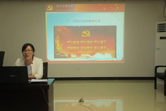為扎實開展“三嚴三實”專題教育、深入理解“三嚴三實”活動的重要意義、使每一位黨員領(lǐng)會“三嚴三實”的豐富內(nèi)涵 ,9月22日下午,東臺公司黨支部邀請東臺市委黨校教研室副主任張碧玉同志講授了一堂以“踐行三嚴三實,恪守黨的宗旨”為主題的專題黨課。支部在司黨員和發(fā)展對象共15人參加了黨課學(xué)習(xí),集團公司黨委委員、東臺公司黨支部書記周金陽主持黨課學(xué)習(xí)。